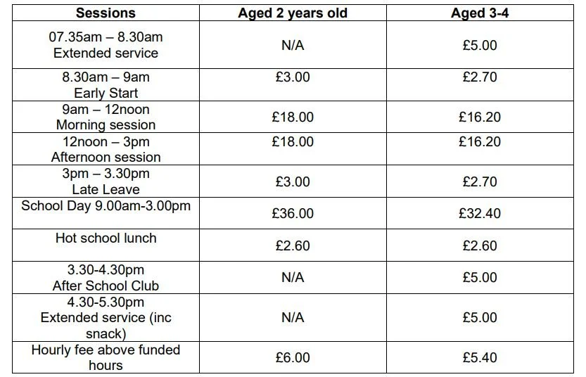 The fees shown are those from 19th February 2024. To find out our current rates please contact the school directly